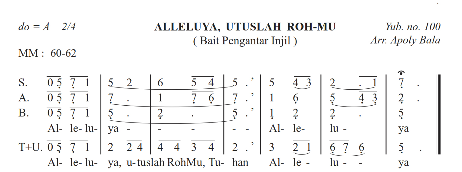 Alleluya, Utuslah Rohmu - Arr. Apoly Balla (Yub. No.100) Alleluya, Utuslah Rohmu - Arr. Apoly Balla (Yub. No.100) 1 file(s) 83 KB Download Navigasi pos Allah Mahakuasa – Arr. Apoly Bala (Yub. No.335)Hormat Sembah Syukur – Arr.Apoly Bala (Yub.No.571)