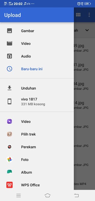 Selanjutnya silahkan anda klik tulisan “Upload” Seperti yang ada pada contoh gambar di atas untuk file [foto, cerita, desain, gambar, rekaman, video, dan lain-lain]