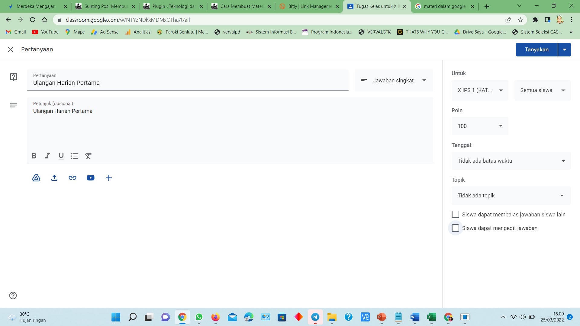 1. Klik buat dan klik pertanyaan 2. Isi Nama Kuis dan lengkapi deskripsi 3. Klik tanyakan Navigasi pos Membuat Tugas Dalam Google ClassroomGloria (Latin) – Apoly Tukan
