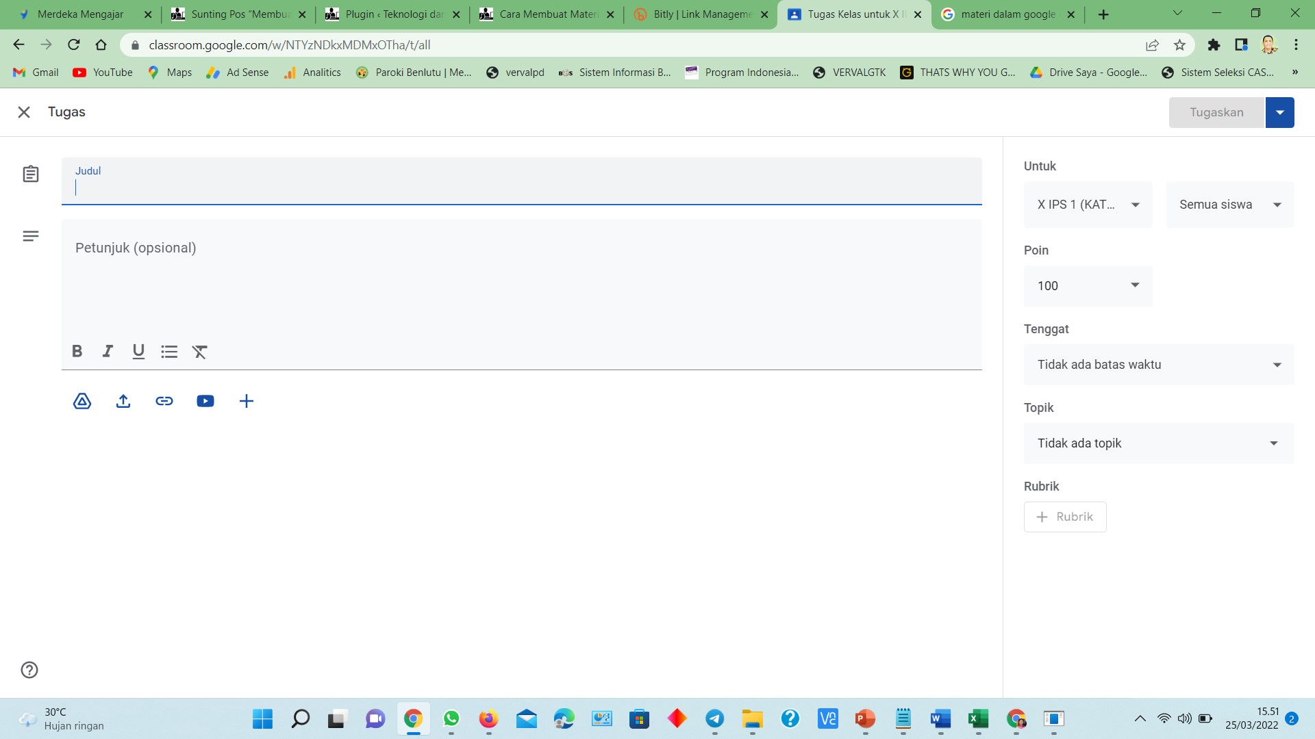 1. Klik buat dan klik buat tugas 2. Isi judul dan deskripsi dan lainnya 3. Klik tugaskan Navigasi pos Membuat Materi dalam Google ClassroomMembuat Tes Otomatis Menggukan Quiz Dalam Google Classroom